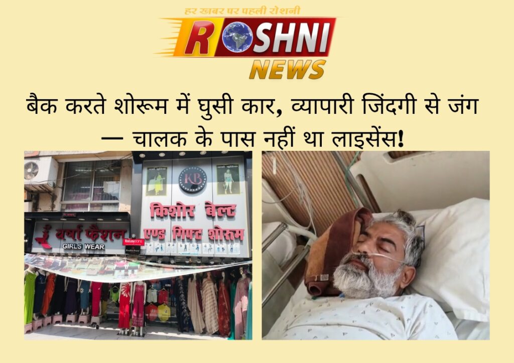 बैक करते शोरूम में घुसी कार, व्यापारी जिंदगी से जंग — चालक के पास नहीं था लाइसेंस,