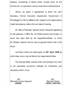 कोर्ट ने संयुक्त सचिव, स्कूल शिक्षा विभाग को निर्देश दिया है कि वे पाठ्यक्रम विवाद, बोर्ड परीक्षा के अचानक आयोजन और अभिभावकों को दी जा रही धमकियों जैसे गंभीर मुद्दों पर अगली सुनवाई से पहले जवाब दाखिल करें।
